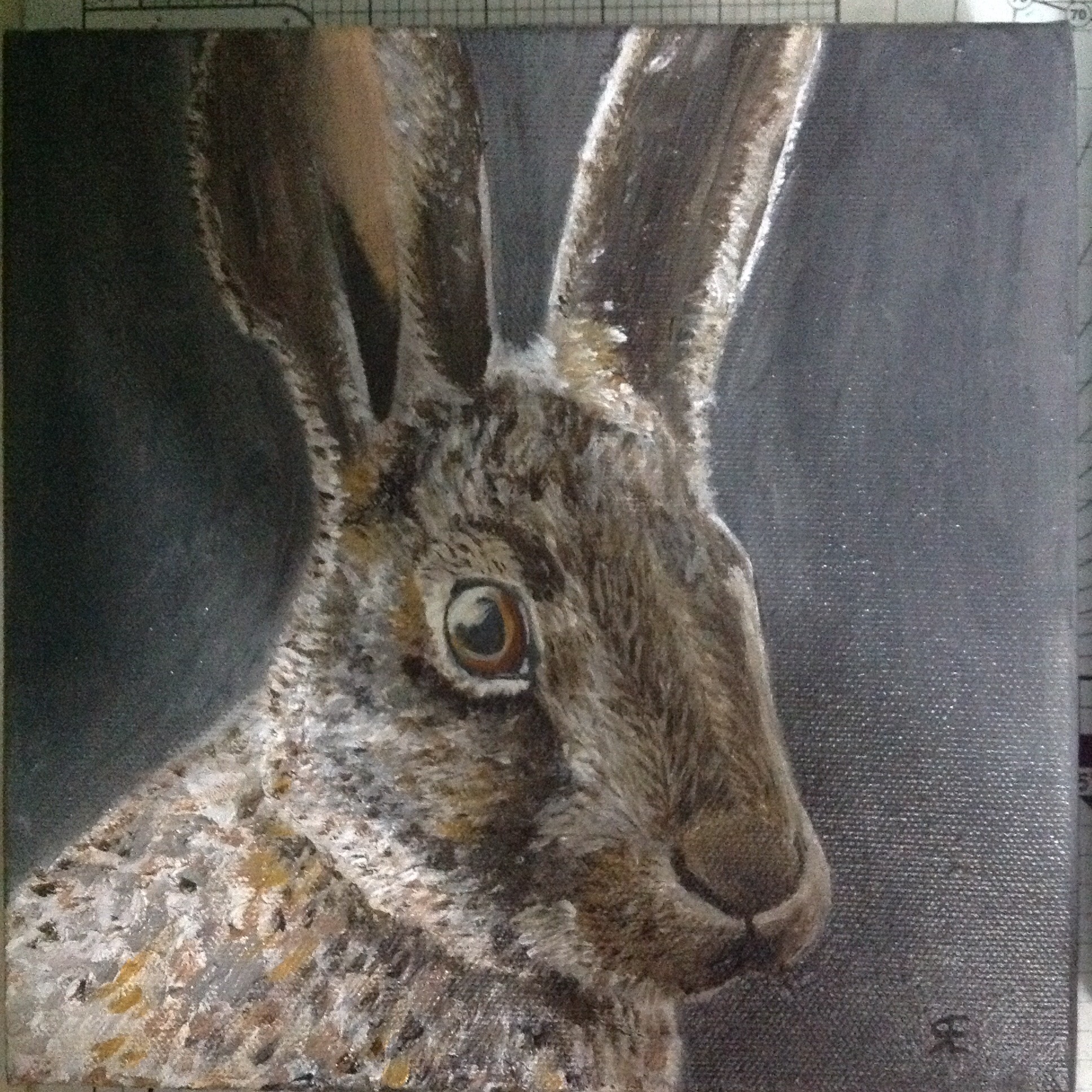 Eventually I think he is complete, but not named…yet, struggled with the whiskers, but decided they would have to do, it really is pretty hard to get a thin line, and I am sure my hand was shaking, with the nerves of putting the oil on the canvas, worrying how the line would appear freaked me out, that much,it is ridiculous. How would I correct it if it went so terribly wrong? Still pheww for me, I am happy enough……..just though of his name, due to the time it has taken’HARE TODAY, GONE TOMORROW ‘.