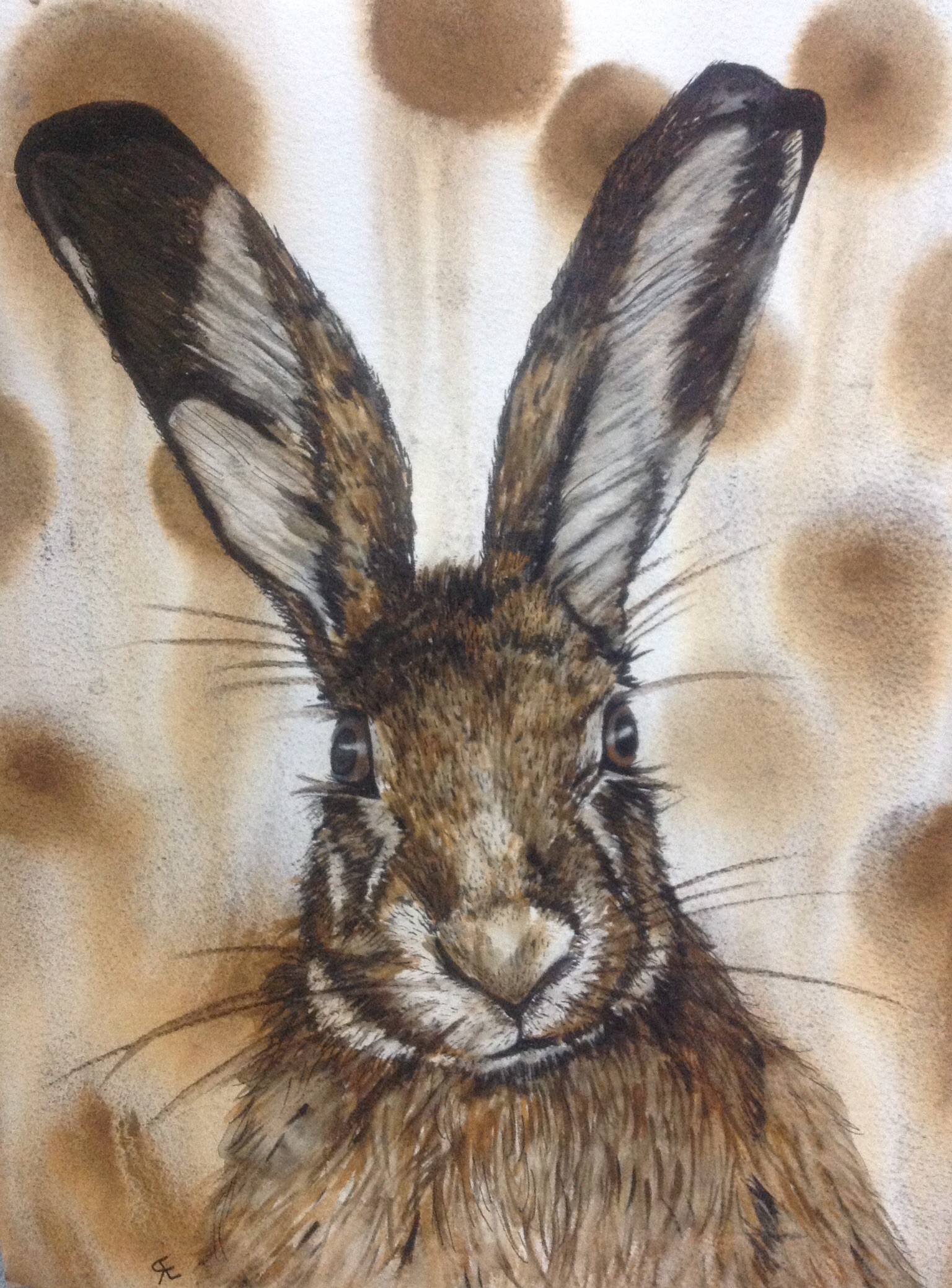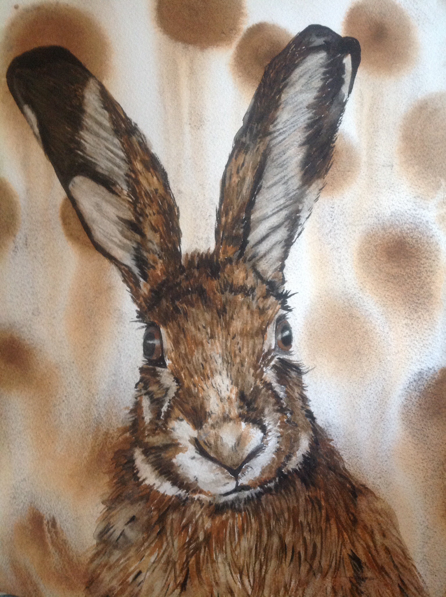 I am really enjoying this rivulet technique with watercolour, this is my take on the background, which I thought was a bit of fun, the brown hare is not finished, but I wanted to post it as I am so excited about the effects you can achieve with the background using the rivulet technique, if you want to try it,please go to my blog post 31st May 2015 (archive) rivulet technique, and click on the YouTube link for a wonderful demo. I hope if you try it you like it as much as me?. I will finish him off today, adding some more hair and light and dark tones, sort out the eyes and add the all important whiskers.