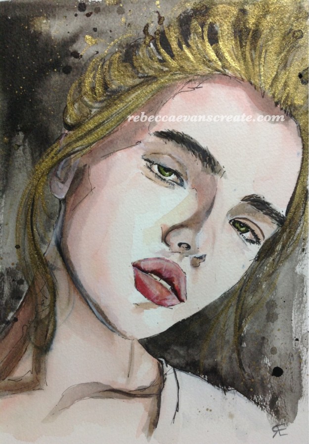 ‘blINK and shine’ Sktchy app reference photo, 7×10″ cold-press 140 lb ink watercolour and gold acrylic