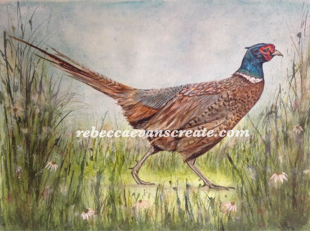 ‘Startled’ pheasant watercolour, with some acrylic! Draw a bird day