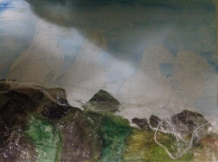 Puffin parade watercolour, using cling film for texture effects on the rocks