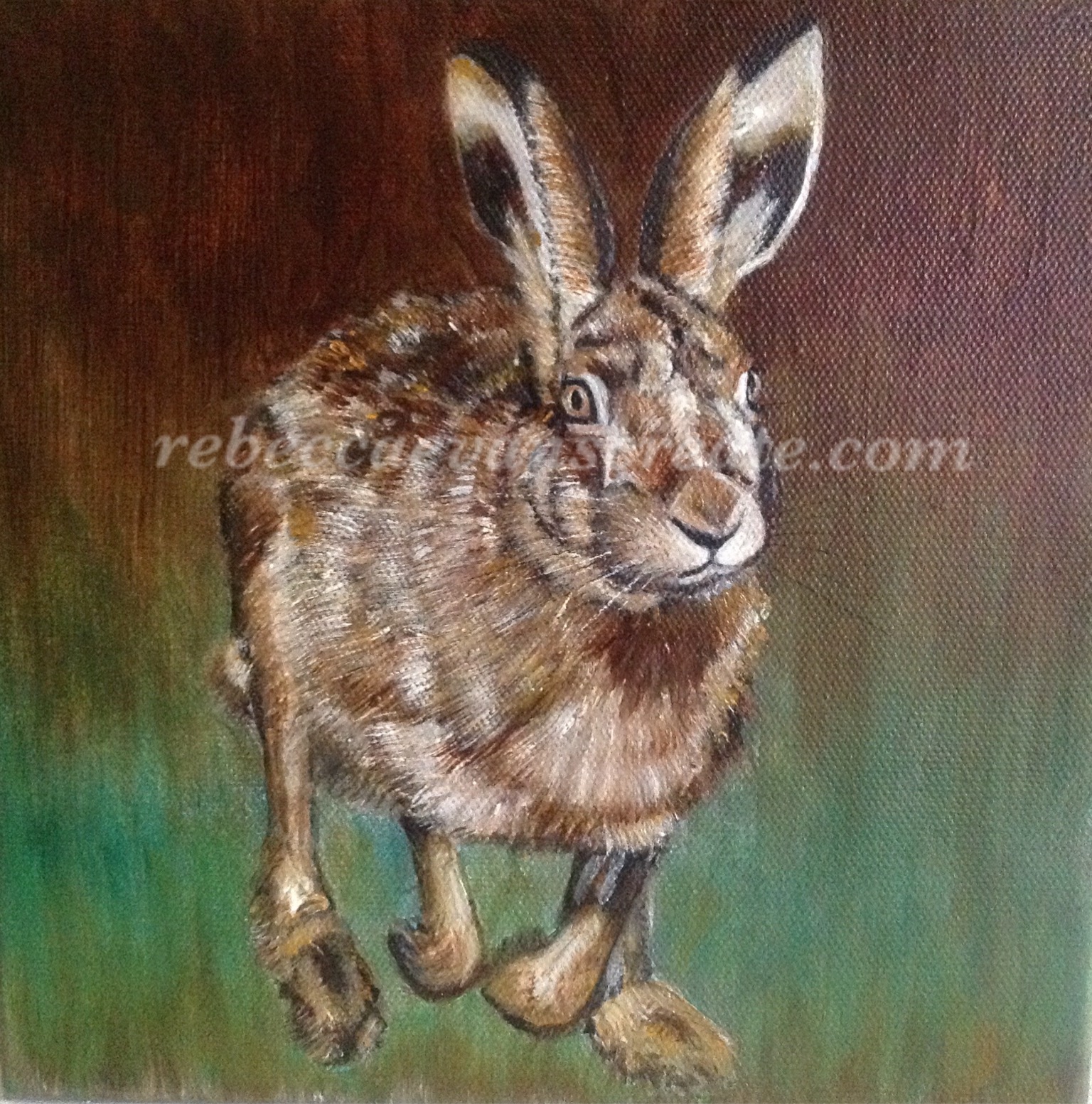 ‘Hop-timist’ hare in oil on canvas 20×20 cm