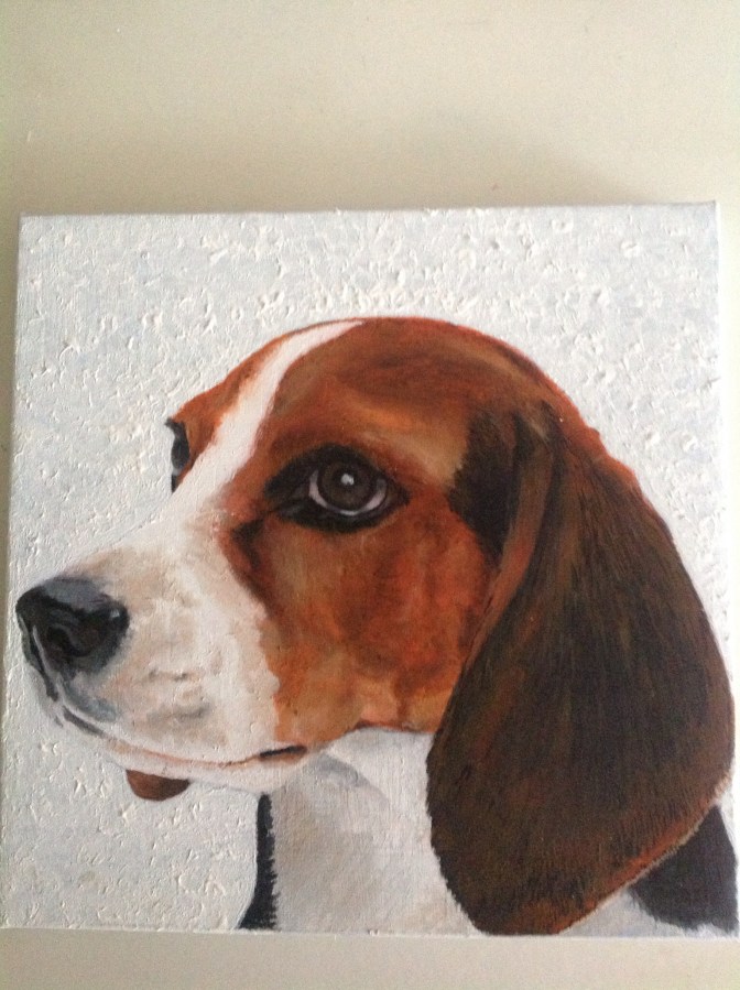 This was one of my submissions for the oakhaven 20×20 auction in 2014. Acrylic beagle. Lovely dogs I think. Now sold