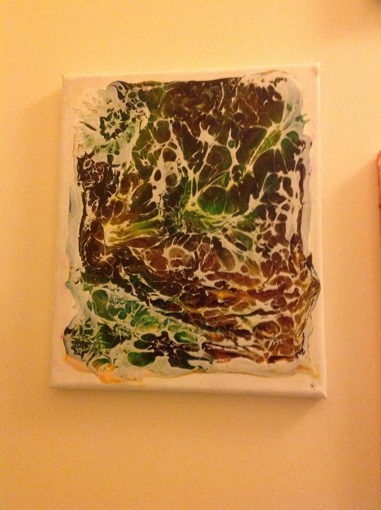 When I can’t decide what to do, I just tip the colours on the canvas a swish it from side to side, these were pebeo paints I had left over, so much fun