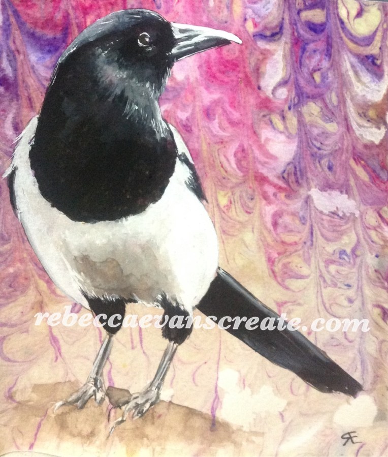 ‘Gaze’ magpie on marbled background mini painting watercolour 90lb coldpress